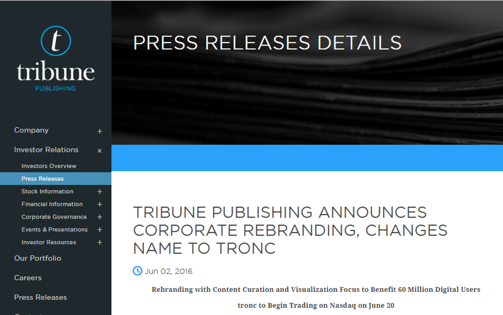 Tribune Publishing originally started in the year of 1847. It scattered throughout the United States after it's start in Chicago from Los Angeles, New York City, and many more published industries. It was a successful hit until June 2nd, 2016. Tribune Publishing announced its change of name from the original Chicago Tribune to Tronc, Inc. Chairmen Michael Ferro proclaims that with the change of name, there can be a positive growth within the company.