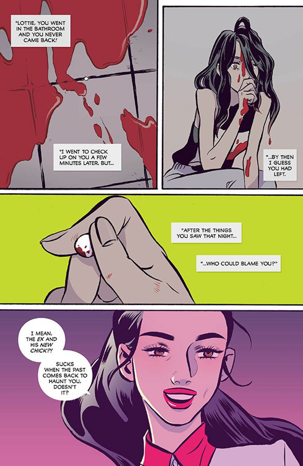 So, we pick up issue 4 exactly where we left off in issue 1, while the narrative follows where we left off in issue 3. I'm sure I made that sound more confusing than it actually is. At the end of issue 1, we were left to think Caroline was dead. At the end of issue 2, we discovered that not to be the case. Finally, in the end of issue 3, we see Lottie run in to Caroline, yet again, at a party. During the first scene of issue 4, we see a portion of what happened to Caroline the night Lottie thought she killed her, while the dialogue is of Lottie talking with Caroline at the party, asking her what happened that night. Which Caroline is SUPER chill about, considering she woke up on a bathroom floor, covered in her own blood.