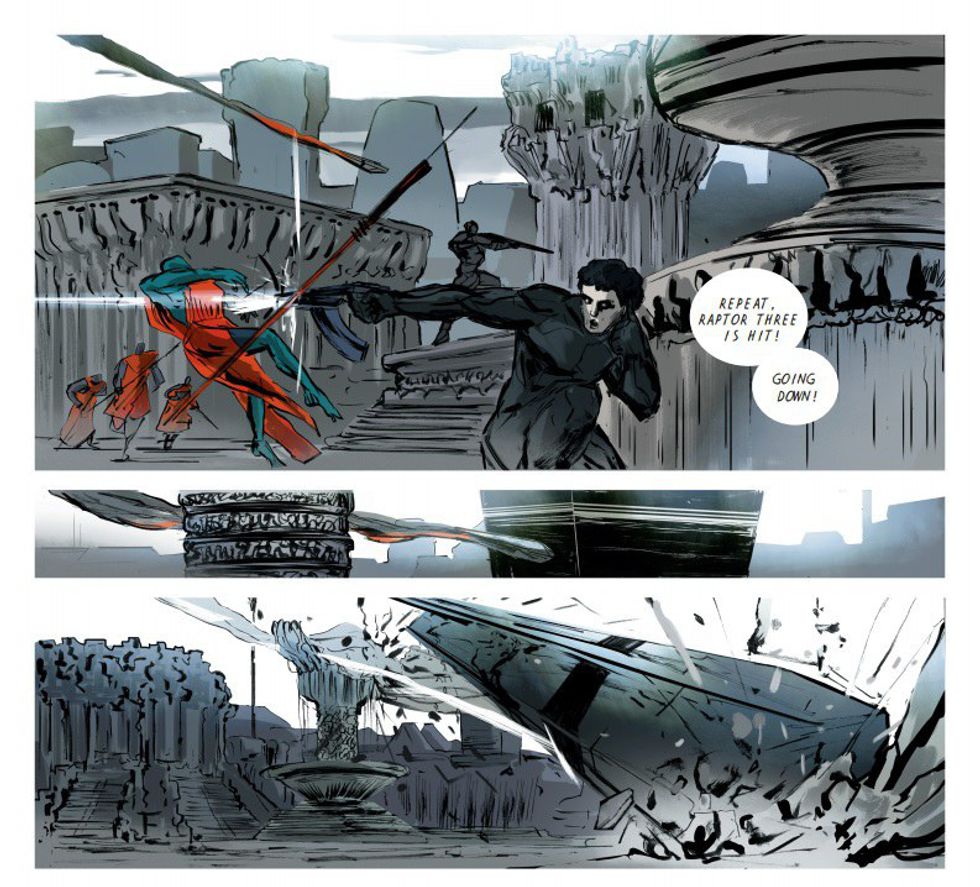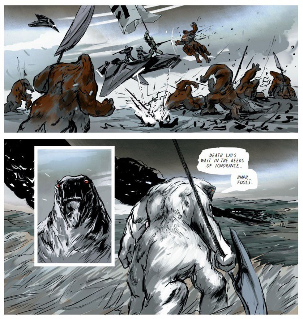 As always, we begin with a data entry log that gives us more information on the humans before landing on the planet. This time, we learn how they planned their escape and how they executed it. It's a very logical and probable plan. Then we cut back to fighting. Despite being lesser equipped, the Yultan know how to hold their own in this spears vs. guns battle. While this is happening in the city, the remaining humans are soon attacked by the Foon. Again, the Foon don't have the weaponry, but they are huge and hard to bring down. They already thrive on battle so the belief that this battle will show their worth makes them even more motivated to slaughter without mercy. Fighting and chaos everywhere. Even Ixandra (with sweet new super powers) is easily pulled into the battle with no side really even knowing why they are fighting. Everyone is pulled in except Quando, a Foon. Which is extra intriguing because the Foon are the brutes while the Yultan are the intellectuals. The Foon are strong warriors, the Yultan are peaceful innovators, the humans were slaves but are incredibly advanced (compared to the other two), and yet here comes Quando, Foon member, being the only sensible being during all of this chaos. And I love it.