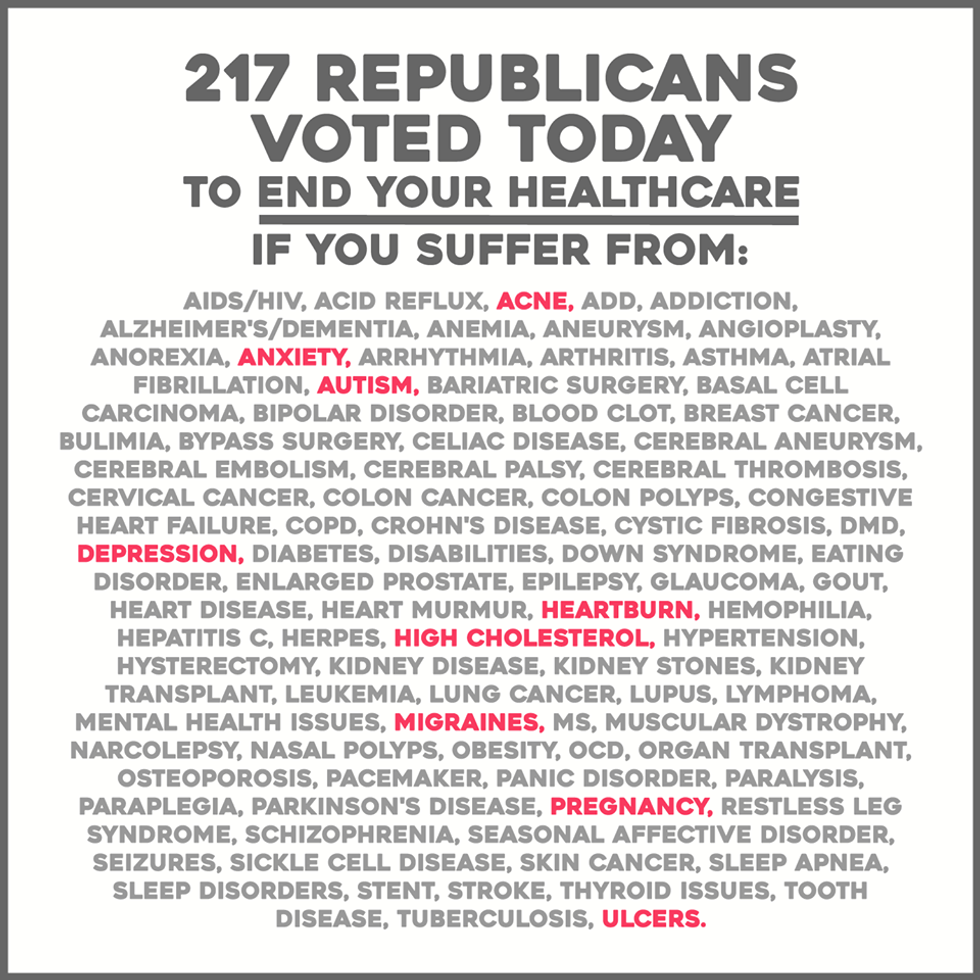 I'm going to start by saying that I didn't initially believe everything on this list, because come on, it's Facebook, and I certainly check my sources. But a little investigation confirmed that yes, this bill garnered enough Republican support to pass the House on May 4, and according to Time Magazine's website, it looks like some of the more ridiculous "pre-existing conditions" listed in the above graphic could actually come into play depending on the insurer.
