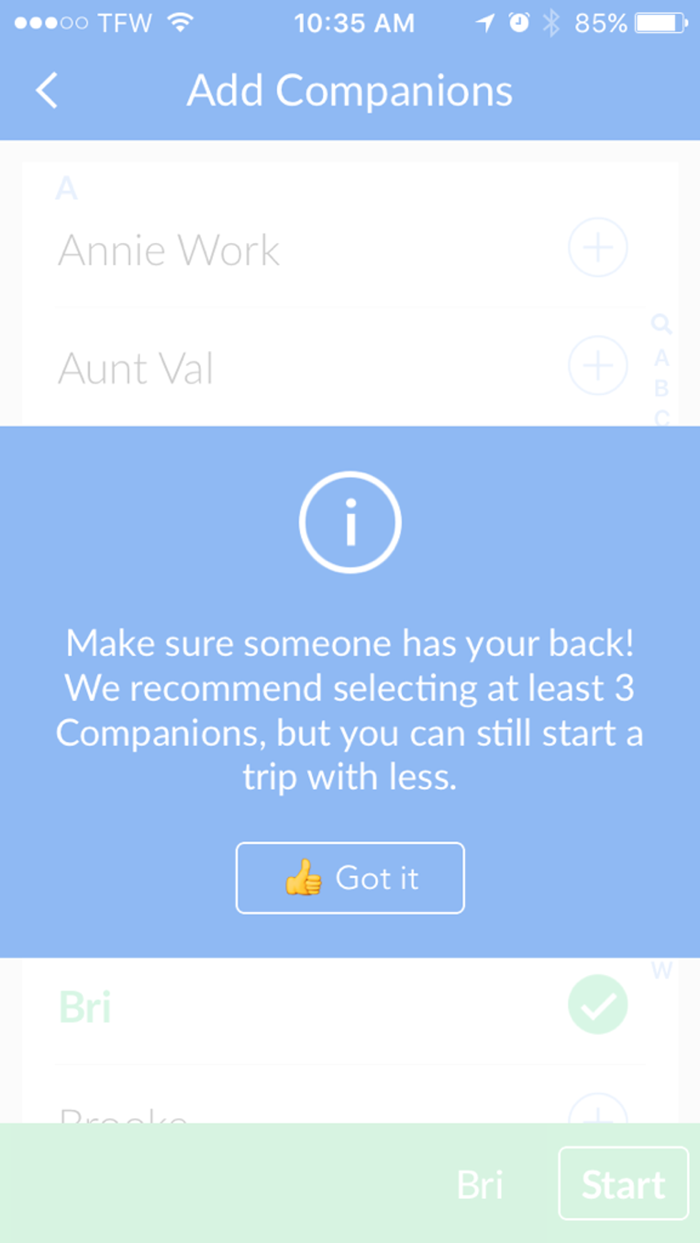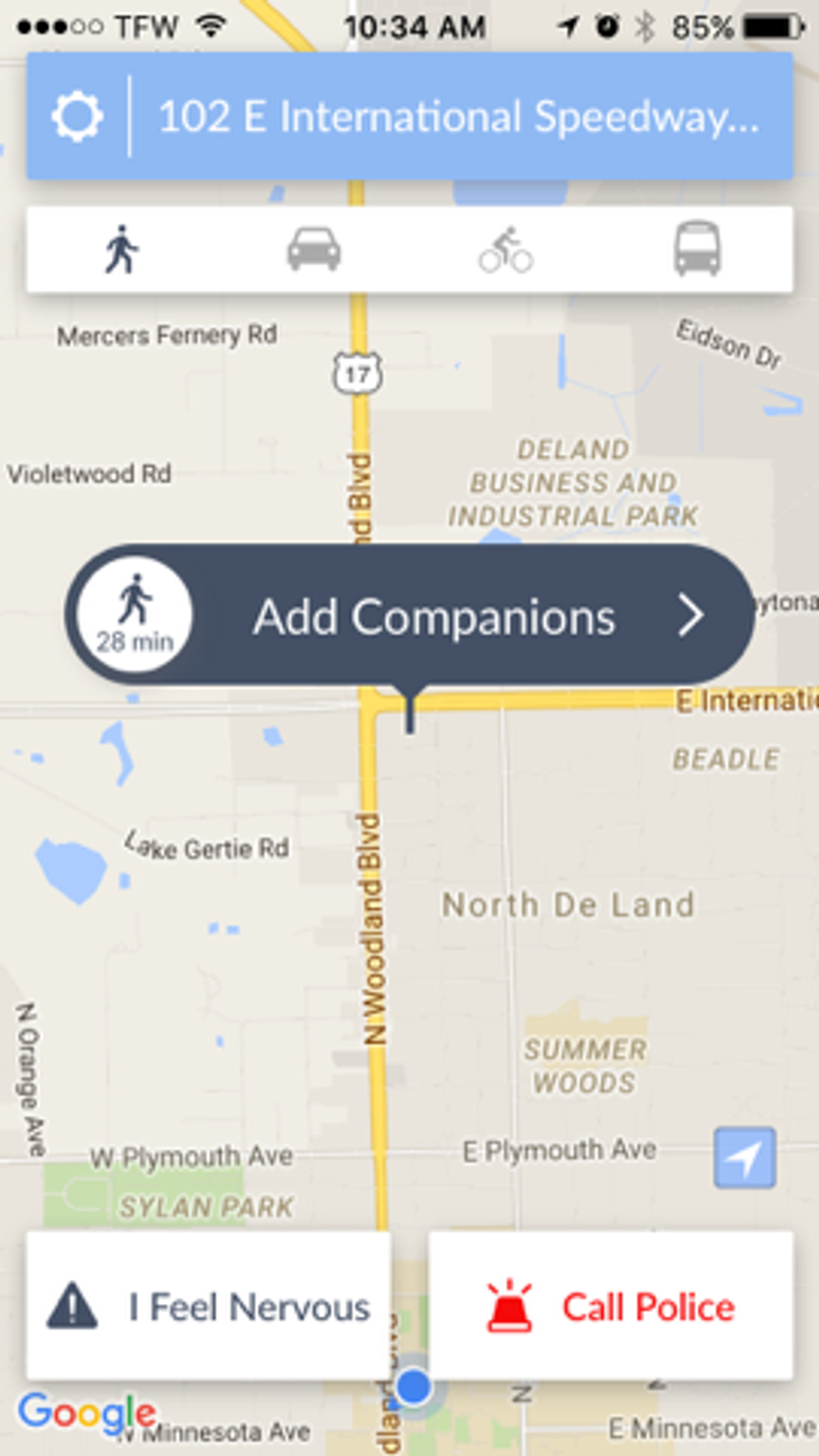 All the user has to do is input their location, pick their mode of transportation (walking, driving, biking, or public transportation), and then pick their companions. The companions do not have to have the app to be apart of the user's journey, just a smart phone. The companions also have the option to call the user at any point, so if for some reason the user starts to travel a different way, or stops for a long period of time where there is no stop light, and they will be able to connect instantly with the user.