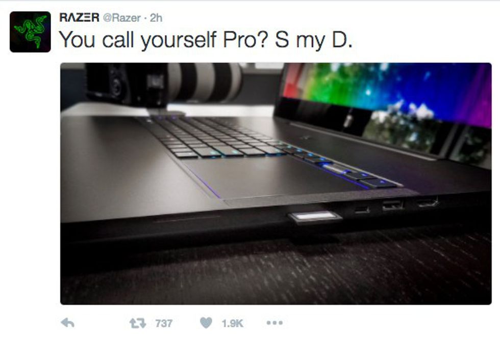 A recent affair that displays this was a conflict involving the popular laptop company Razer. After the announcement that the new iMac would not have an SD card slot, the popular company made a joke on Twitter, saying "You call yourself Pro? S my D."