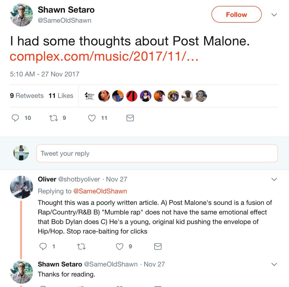 In the article by Shawn Setaro, Setaro goes on to say that the two terms are the same thing, which they obviously aren’t, and that Post Malone was “running away from rap since he began reaping the benefits of the association,” which is also not true.