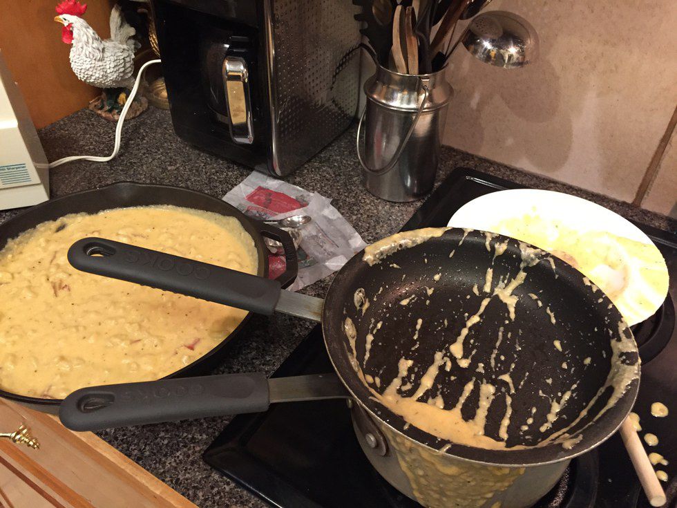 Here came my biggest (although not gravest) problem. In the video, a small skillet appears to be used by the demonstrator. I soon realized, after beginning to pour the mac 'n’ cheese, that my chosen pan was way too small. My next choice was too small as well. Therefore, I had to break out the big guns, switching to a 12” cast iron skillet.