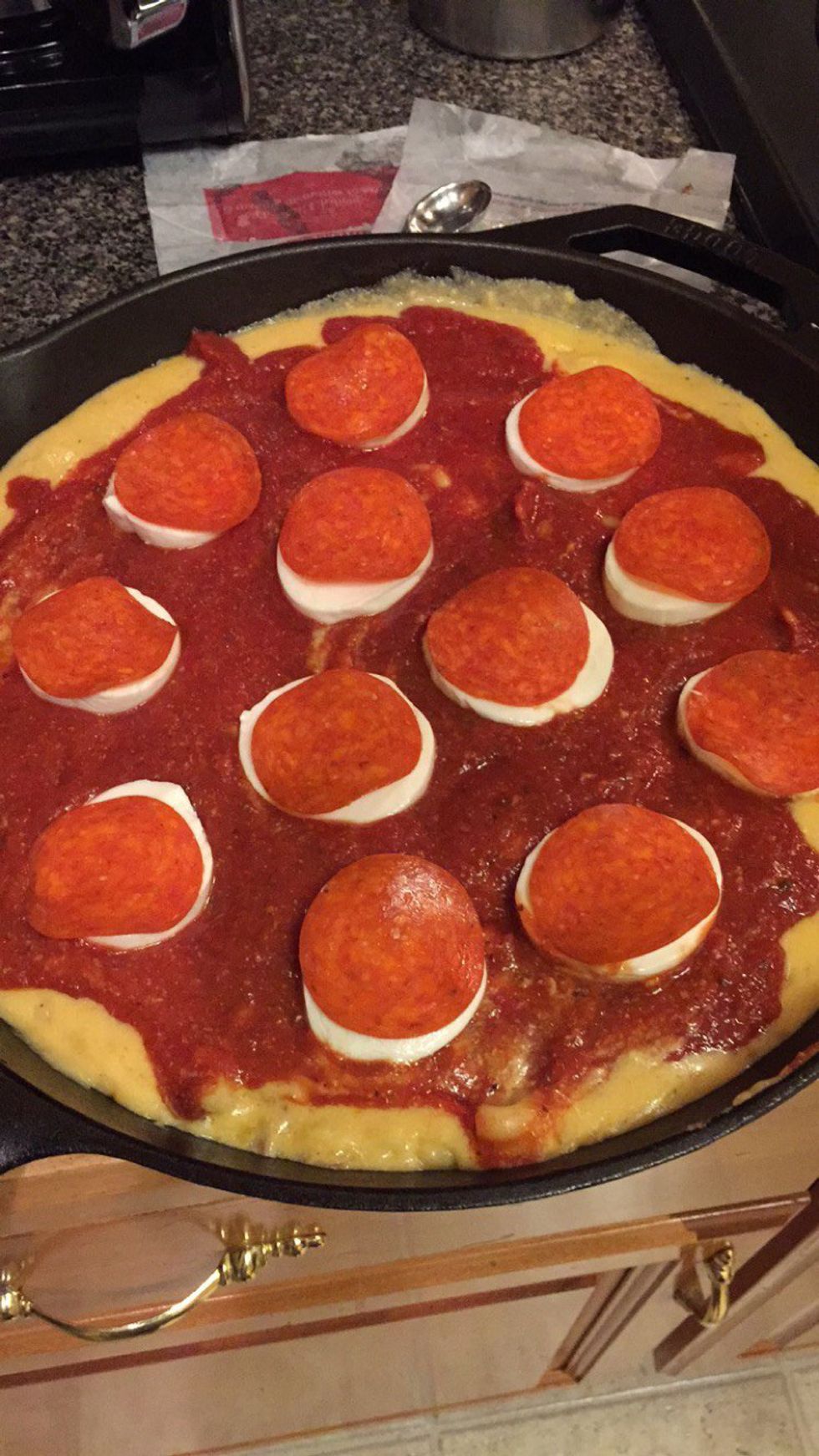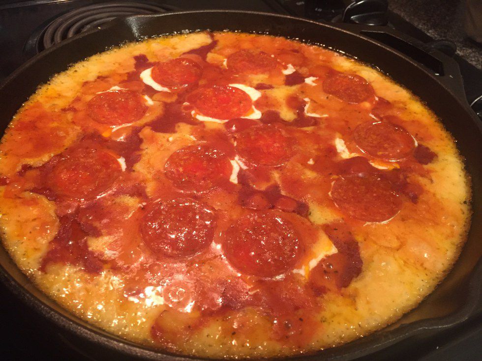 Last came the “pizza” part. Marinara sauce is spread evenly over the top and covered with fresh mozzarella slices and pepperoni. It baked for 25 minutes, and came out almost comically cheesy, with a slight bubbly crust covered by a thin film of cheesy oils.