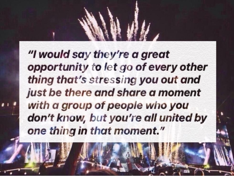 Many fans describe concerts as their home, because they feel safe, loved, and united. The world can be an awful place, filled with people who want to hurt others. Everyone experiences stressful situations and bad moments. Concerts are events that allow you to feel safe and happy. They are places where you can be yourself, sing as loud as you want, and scream until you lose your voice. You can let go of everything for a few hours and focus on enjoying yourself.