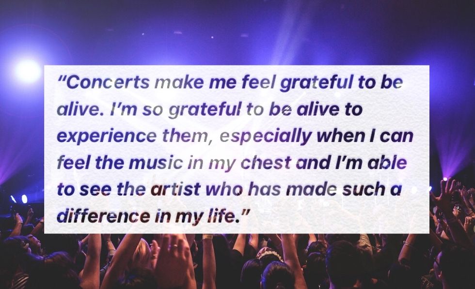 I asked my friends and Twitter followers to describe how concerts make them feel, and I have included their quotes below.