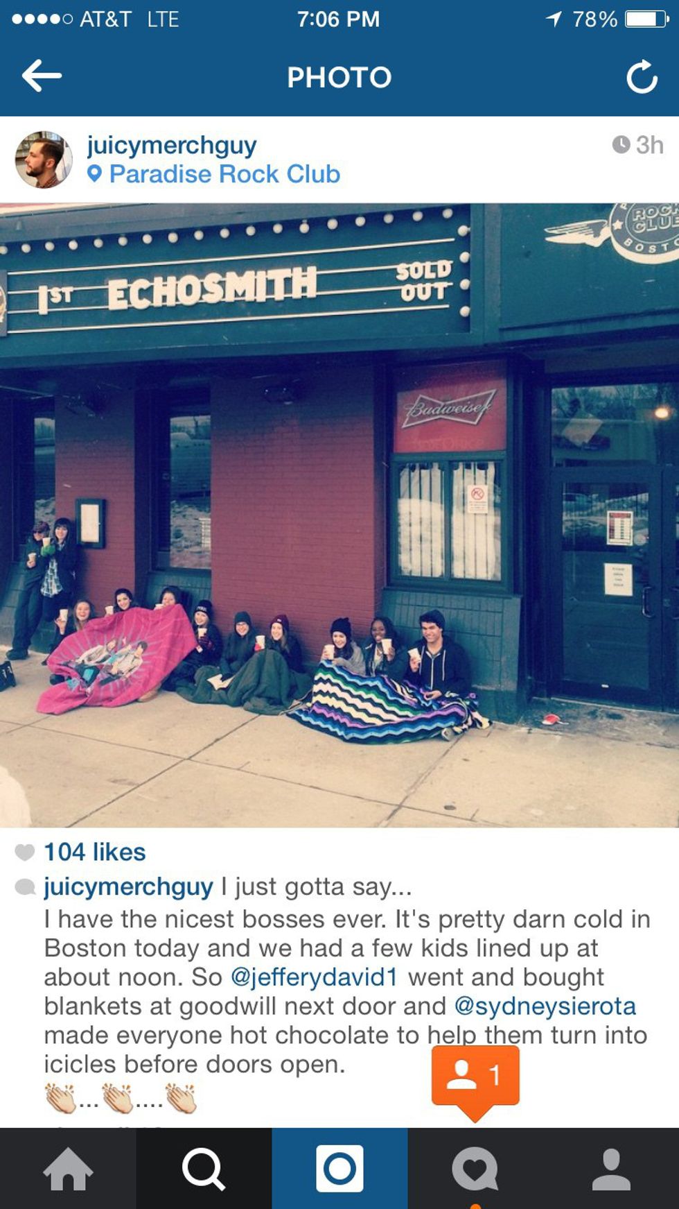This is probably one of my favorite concert memories and it wasn't even during the concert. My friend and I saw Echosmith in early March of 2015. 2015 had been a terrible winter for Boston with record-breaking snow totals. By March there was still significant snow on the ground, but I was sick of it and just wanted to pretend it was spring. We got to the venue around 1 p.m. because Echosmith would do a free meet and greet for the first 20 people in line and we wanted to be sure we were two of those 20 people. Turns out we were probably 6th and 7th in line and the line didn't get to 20 for another 3 hours. So there we were waiting in line for five to six hours before the doors opened and it was COLD. We were wearing jackets and gloves but warm clothes can only do so much when you're out in the cold for an extended period of time. Echosmith's merch guy (Dylan) saw the few of us sitting on the cold ground and he had no idea how we were surviving since the band is from California. Dylan and Echosmith's manager/dad (the members of Echosmith are all siblings) decided to go to the Good Will next to the venue and buy blankets for us. The one my friend and I got was a Camp Rock blanket with the Jonas Brothers on it; it was amazing. We couldn't get over how thoughtful they were to go out and buy some blankets for us freezing fans. Then a few hours later, Sydney, the singer of Echosmith, came out of the tour bus and brought us some hot chocolate that she made! I will never forget that the singer of one of my favorite bands made me hot chocolate. She even made lactose free hot chocolate in case anyone in line was lactose intolerant. It was so cute! The concert that night was absolutely amazing but I think I will remember my line experience more than anything.