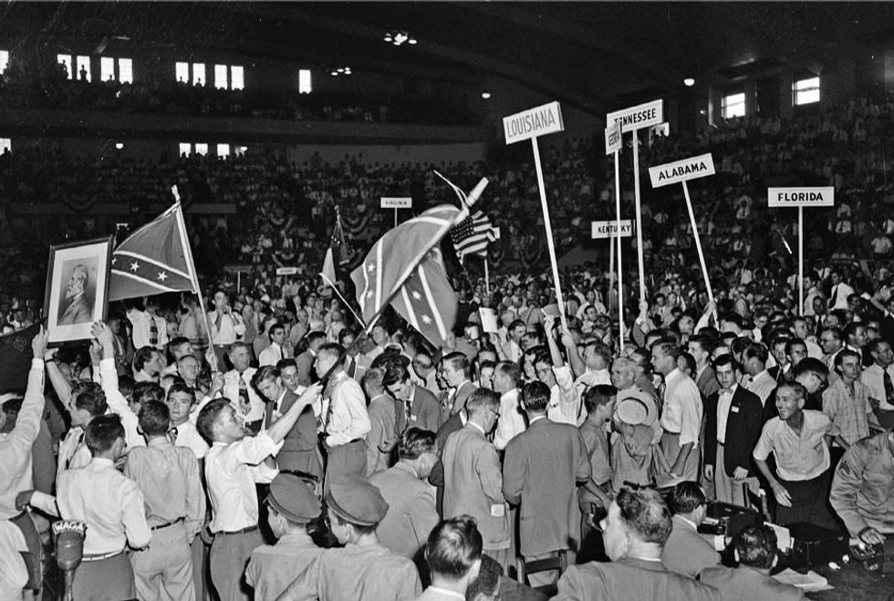 "Student delegates from Southern colleges and universities waved [Confederate] battle flags on the floor of the Southern States Rights Party convention in July 1948."