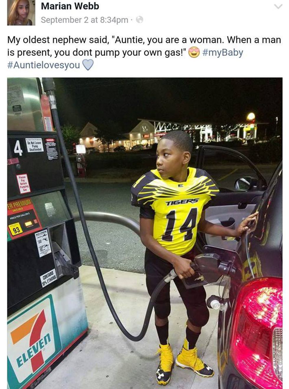 What I saw was a picture of a little boy pumping gas for his aunt which was accompanied by a sentimental caption where the aunt was explaining that her young nephew told her that while a man was around, no woman should pump her own gas. This is a perfect example of traditional chivalry from a man (or in this case a boy), towards a woman.