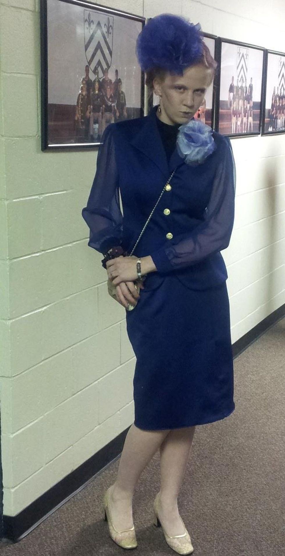 Halloween of my junior year of high school, I was wanting to go to the school’s Halloween party as a giant “Tangled” obsessed toddler, but if I went to school in an adult onesie, that wouldn’t be exactly appropriate. I came up with the idea to be Effie Trinket. The result is the photo above.