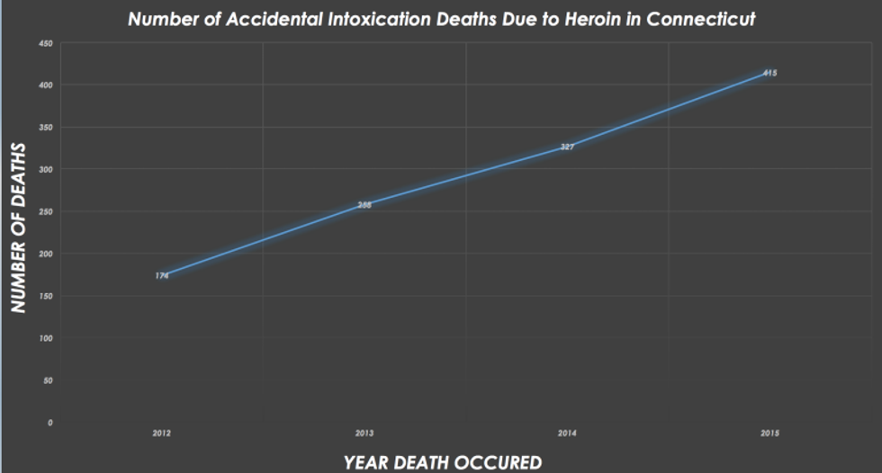 Pictured above: Graph demonstrating the increasing death toll from heroin in Connecticut. Data collected from Office of the Chief Medical Examiner.