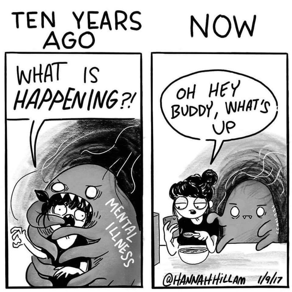 Having a mental health problem now is an entirely different ball game but in a good way. It is often like playing an MMO and playing the tutorial level, fighting the same enemies, although this time the experience you have and your big fuck-off sword destroys these enemies in a few hits.