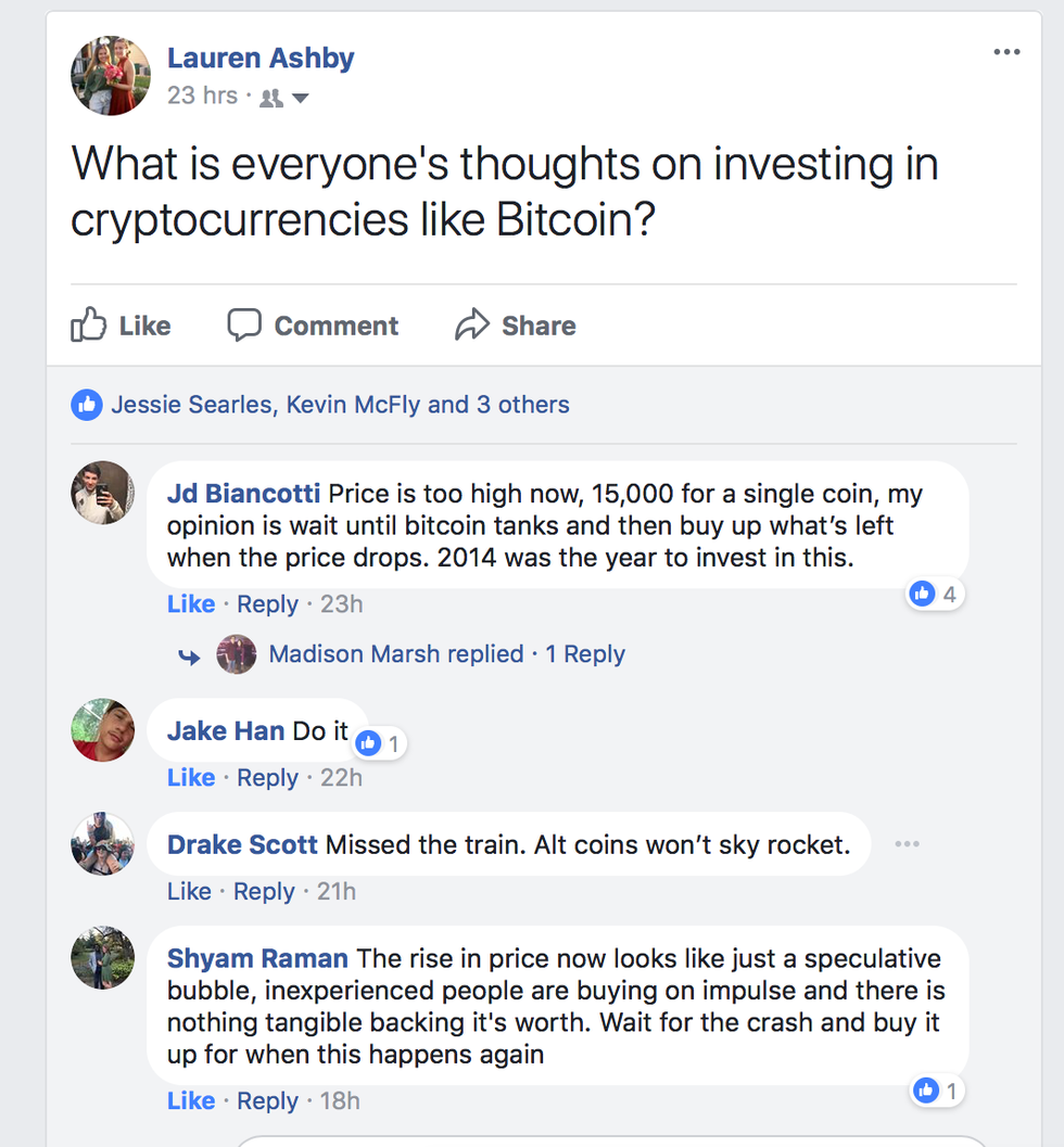 When bitcoin first launched in 2009, bitcoin was being sold for $0.29 a bitcoin. It then led to a drastic jump to $28.92 in July of 2011. As of December 4, 2017, one bitcoin costs $11,590.00. Luckily, I was able to invest before the price of bitcoin hit $14800 by the end of December. When I reached out to the Facebook community for opinions, users thought the price of bitcoin was too high and recommend investing when the price drops.