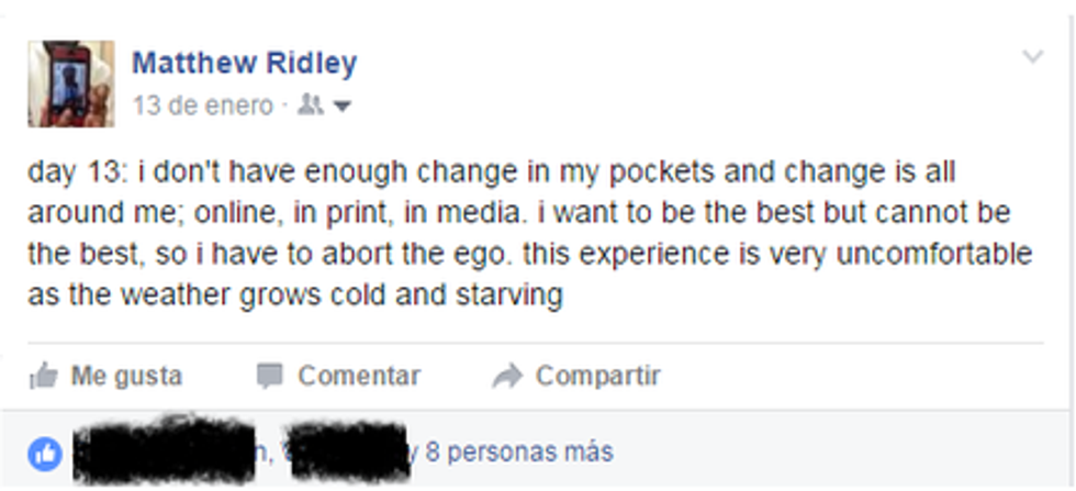 Many of the posts I make on my own page appear to come more from a sense of abstract self-expression than they do in order to ask a question, or comment about a particular topic. Then I consider the composition of my friend list, the pages and people I follow, and the articles that pass along my news feed, and I think, what's the composition of my network? How well would this work by hinting at my problems but not being downright explicit?
