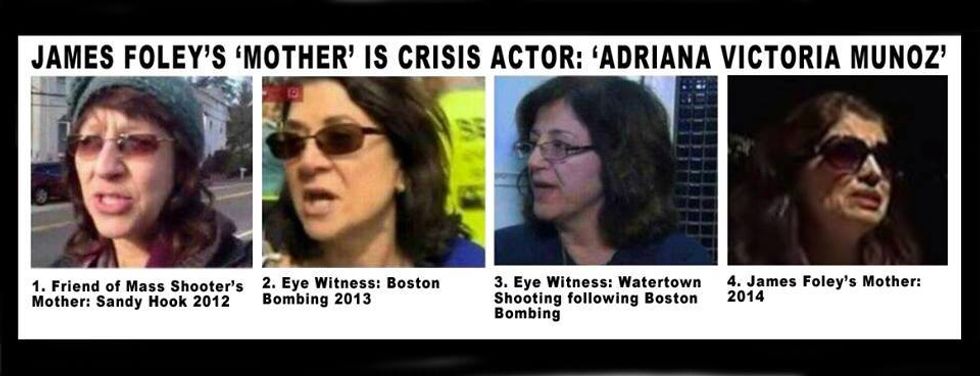 The woman above who was originally thought to be James Foley's (U.S. journalist that was beheaded in Syria back in 2014) mother was apparently discovered to be crisis actor Adriana Victoria Munoz. She is not only "James Foley's mother," but was also a witness at the 2013 Boston Bombing and later at the Watertown shootout. She was even a "friend" of the mass shooter's mother in the Sandy Hook massacre (which could be more evidence that would support Alex Jones' claim).