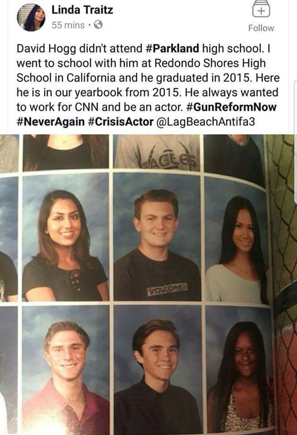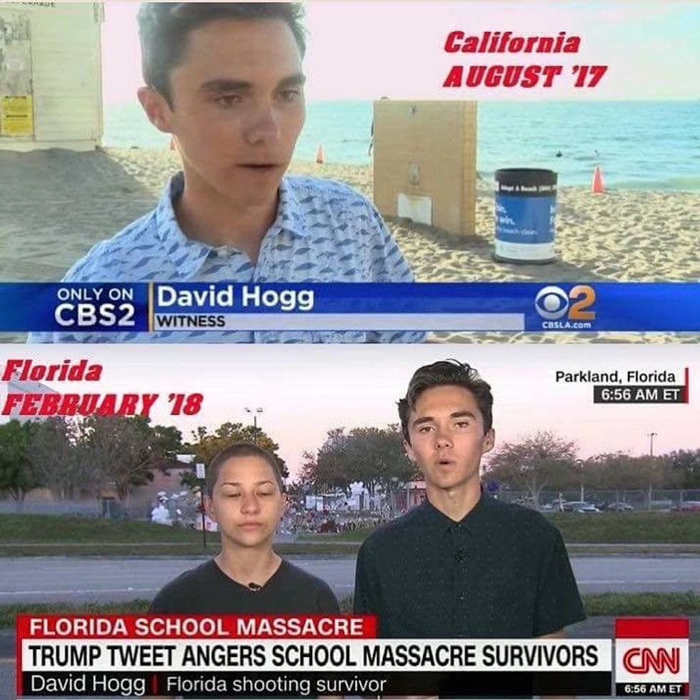 Munoz was not the only person accused of being a crisis actor. The newly fame acquired gun-control activist David Hogg, was another crisis actor exposed. Most of us have heard of the recent tragedy of the Parkland shooting that took place in February of this year. Hogg was one of the few students interviewed after the tragedy and claimed to be a bystander during the event. When news of this hit social media, it took a weird and confusing turn. Interviews started surfacing of him claiming that he was not at school in the morning until he grabbed his camera and rode there for evidence. Many people started claiming that David Hogg was not actually a resident of Florida or even a student at Stoneman Douglas High School. He was accused of living in California and not being a current student at all.