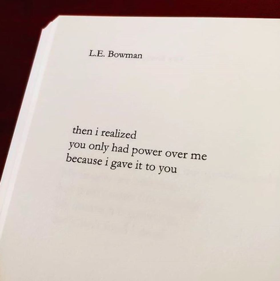 Thanks to the beloved "explore" feature on Instagram, I have been exposed to one of my favorite poets at the moment: L.E. Bowman. Bowman's work features very strong female voices that discuss a variety of topics that I believe are relatable to many modern women. Her book, "The Evolution of a Girl", is described as "a book for those who are hurting, for those who are healing, and for those who are ready to try again."