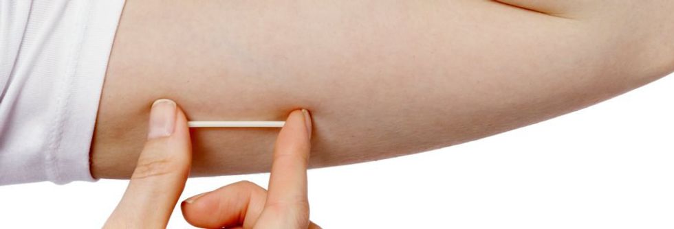 The implant birth control is a little rod about the size of a matchstick that gets inserted in your upper arm. Your doctor numbs the area and inserts the rod that is then out of sight and out of mind! It releases the hormone progestin which prevents ovulation and thickens the cervical mucous to prevent sperm from reaching the egg. Less than 1 out of 100 women per year will become pregnant while using this method—so it’s pretty darn effective. What’s great about the implant is you don’t have to worry about it once it’s implanted; it offers continuous, long-lasting birth control for up to three years; you can use it while breastfeeding; and the ability to become pregnant returns quickly after use. Side effects are irregular bleeding within the first 6-12 months of use, change in sex drive, discoloring or scarring of the skin over the implant, headaches, an infection or pain in the arm, nausea, pain at the insertion site, sore breasts, and weight gain. Most of these side effects are rare!