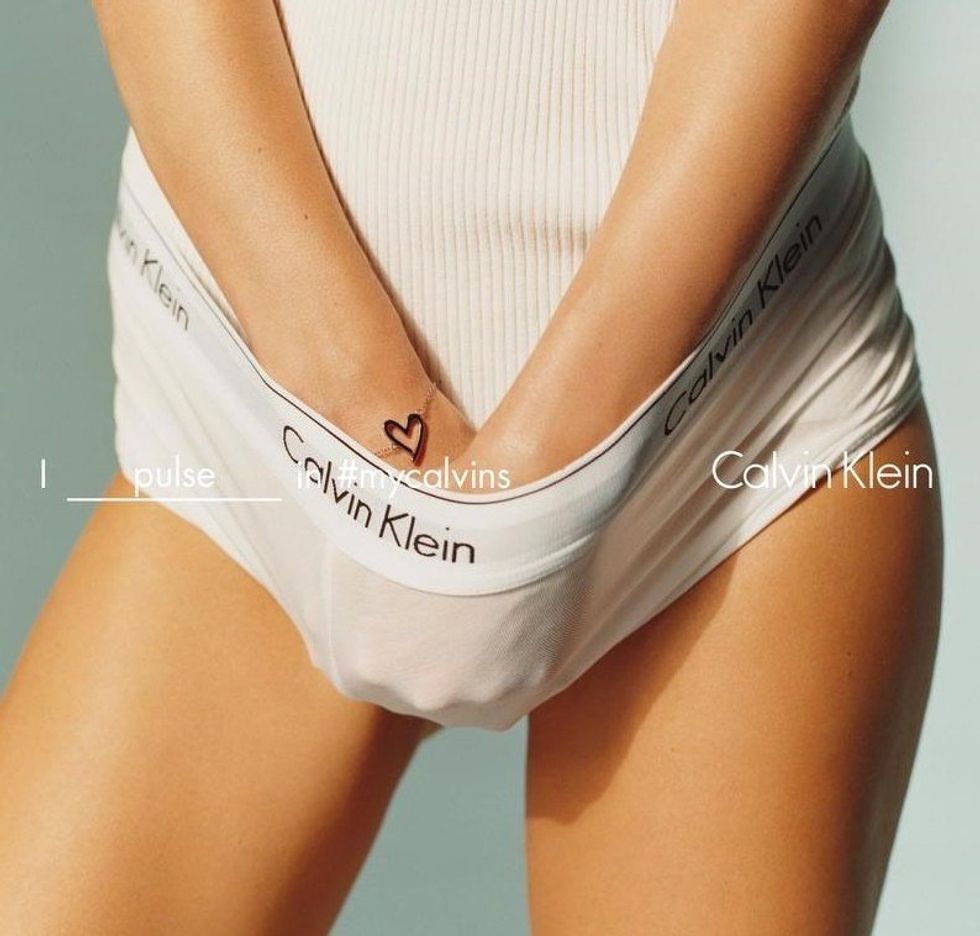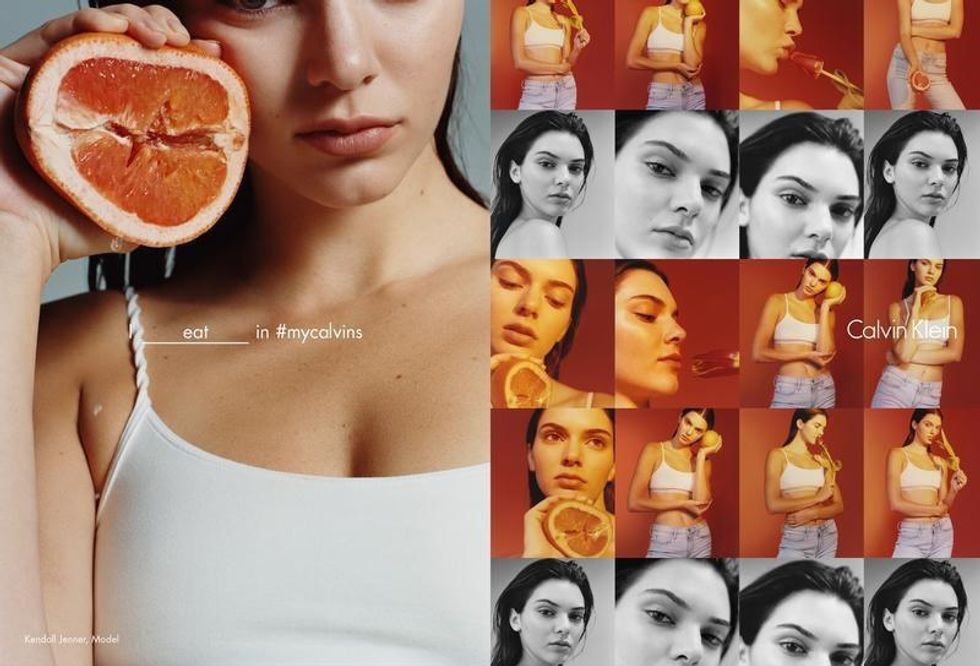But now the #mycalvins campaign is back in the news, this time for their latest rotation of Spring 2016 ads. Always at least a bit explicit, this newest crop of photos, shot by Harley Weir, come with distinct sexual connotations. Featuring female artists and models, in ways the ads seem to be a celebration of female sexuality. Abbey Lee Kershaw "pulses" in her Calvins, implying self-pleasuring. Kendall Jenner plays into the longstanding combination of food and sex by "eating" in hers. And an unnamed model takes a "belfie," which, like it's facial counterpart the selfie, is a move of self-appreciation.