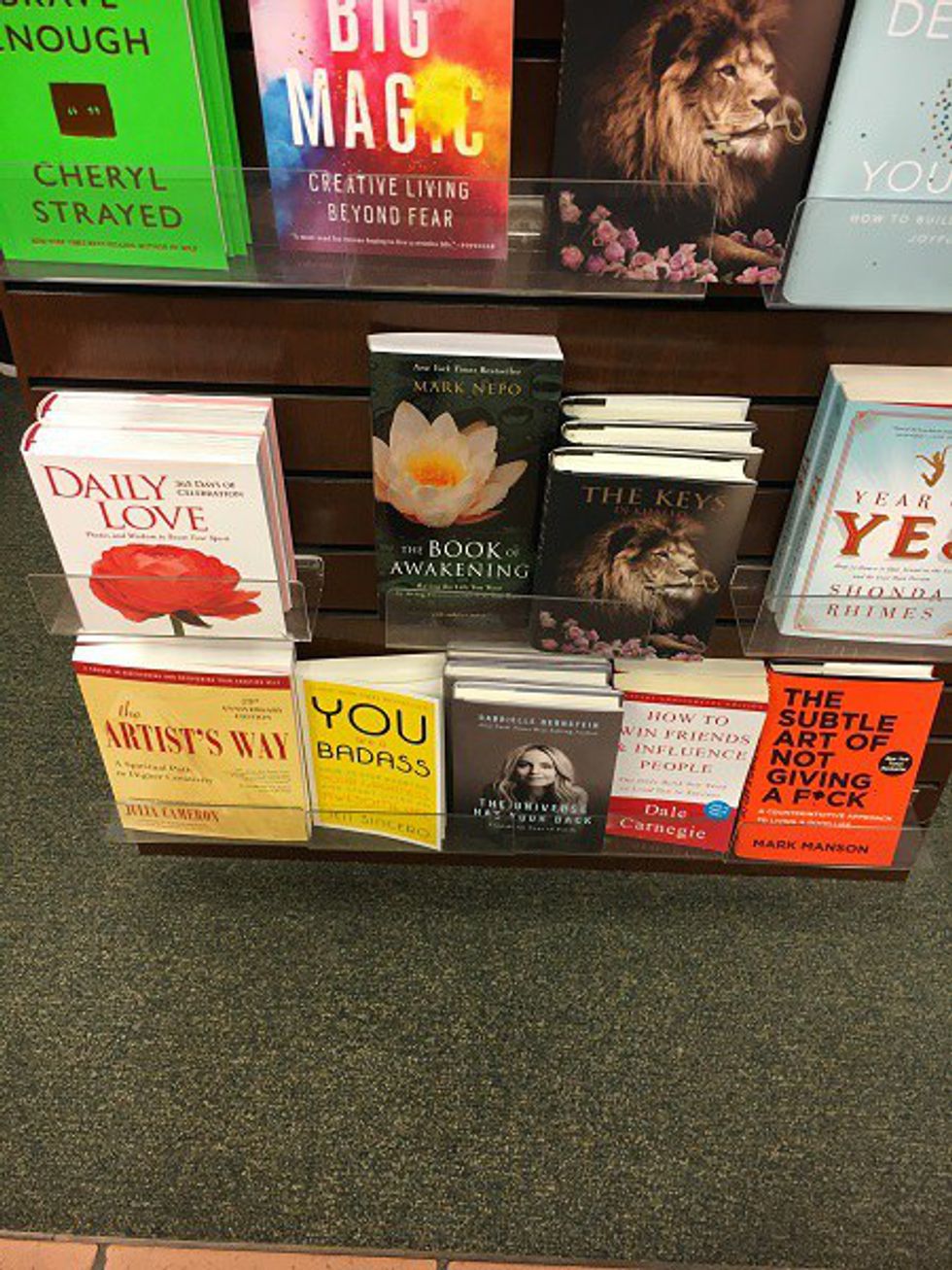 My favorite in this endcap was the one in the picture below with the lion holding a key titled “The Keys.” That does have a true Biblical look and feel to it, doesn’t it? I mean the keys to the kingdom and Daniel in the lions’ den and all. It was nothing like that at all. It was a book about respecting the code, securing the bag and glorifying success by recording artist DJ Khaled (no, I don’t know who that is.) Despite all my searching, I didn’t find any of the books written by the Franciscan Friar or several of the other Christian writers I hoped to find. I did find two short shelves on Eastern Religions right next to the Christian fiction section. I thought that was an interesting choice of locations.