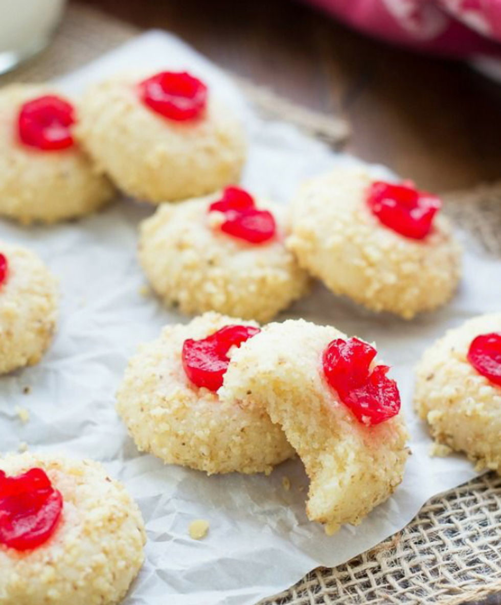 While I'm not a big fan of rolling cookies in walnuts (you can leave that part out if you like), this cookie is a delight. If you don't like cherries, you could always press your thumb on the top to make an indentation and bake with a tiny dollop of jam in the crevice. Bonus!