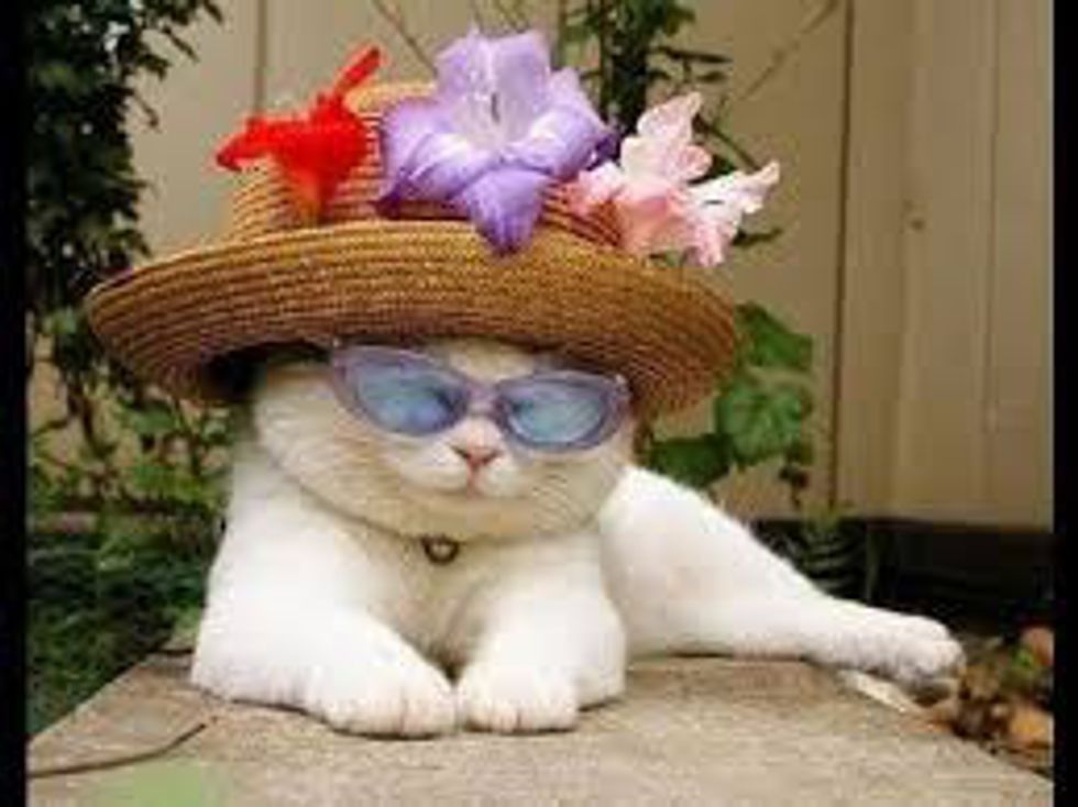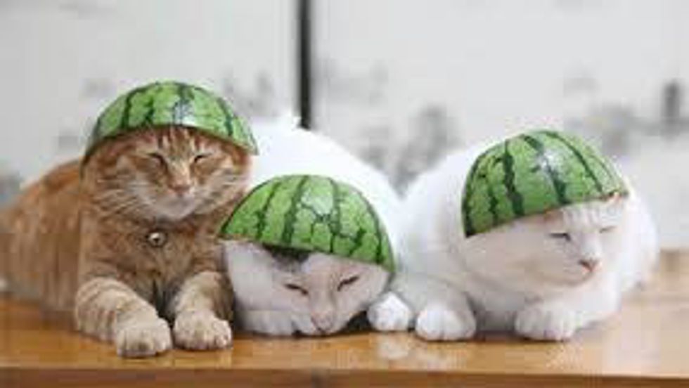 I applaud these cats on their creativity and their choice of hats. They look quite pleased with themselves as well. This is what I call high fashion. In fact, I think they compete with the top designers in the world. I would buy one of their fancy watermelon hats myself.