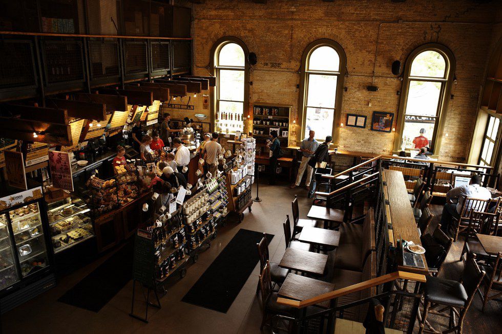 Milwaukee's historic River Flushing Station, Colectivo transformed this space into a coffee shop on Milwaukee's lakefront. This space overs cozy tables, and during the warmer months there's seating outside of the building.