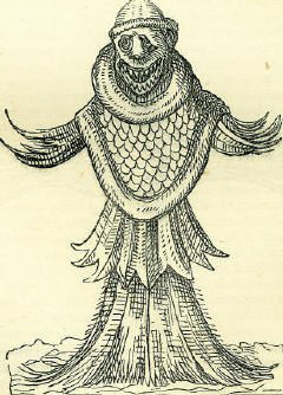 Anyway, he was seen in the 1500s and is most likely an oddly decayed shark, squid, walrus or simply a hoax like a Jenny Haniver (which are interesting in their own right, and though fake, are as terrifying as any abominable seapriest).
