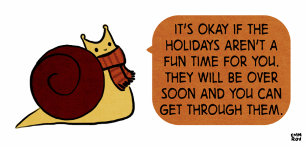 Please know that you are valuable, important, and needed. You can get through this holiday season, I believe in you. Try to take care of yourself. It's okay to put your health and safety first. It's okay to not stay for the entire holiday event, or even just say no to them. Take time to rest between events. Stay safe, and stay strong. Spring will be here before we know it.