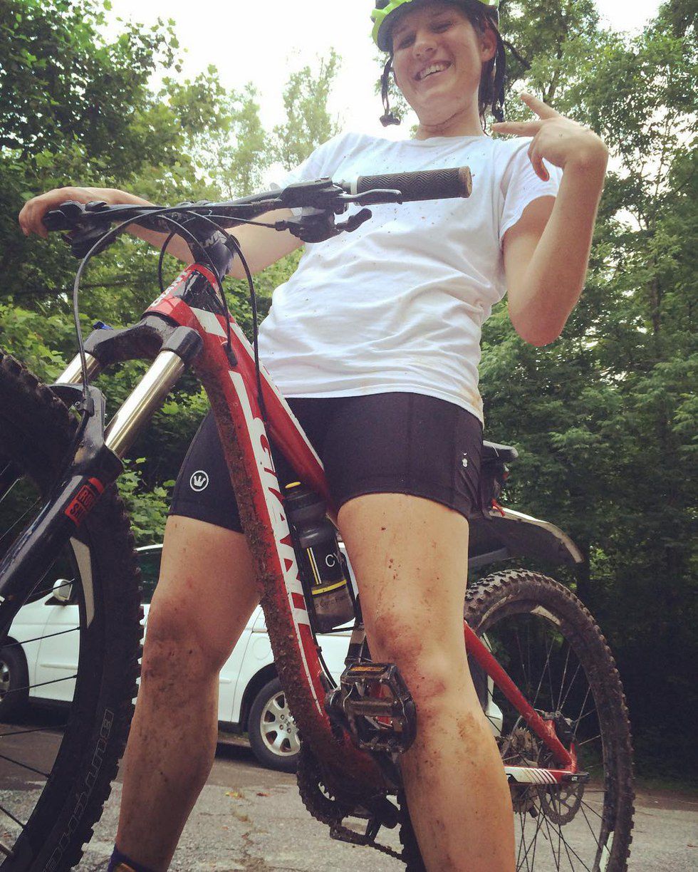 On a mountain bike I felt like one of these “noobs” on the soccer field who wear giant shinguards. I don’t own any cool gear. I don’t know what I am doing, and I often have to get off the bike and walk hard climbs or crash in embarrassing ways. Everyone is SO encouraging, though. No one cares that I suck!