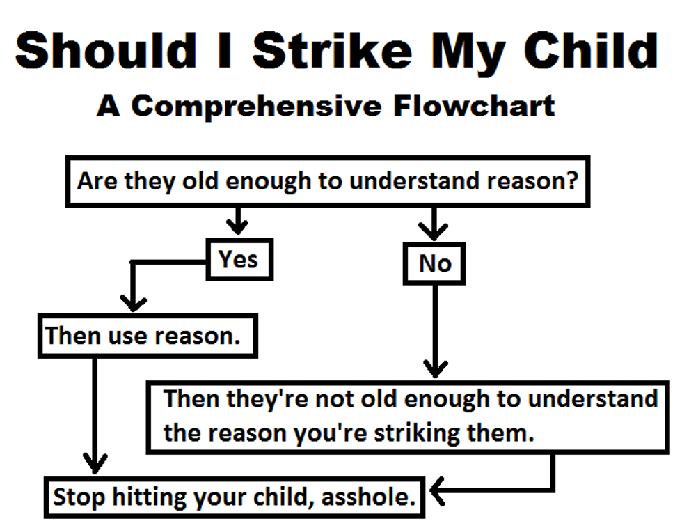 It seems to be that the flowchart uses reason as a rationale for corporal punishment or not, and no matter what, those who might use the flowchart come to the conclusion that they should "Stop hitting [their] child, asshole."