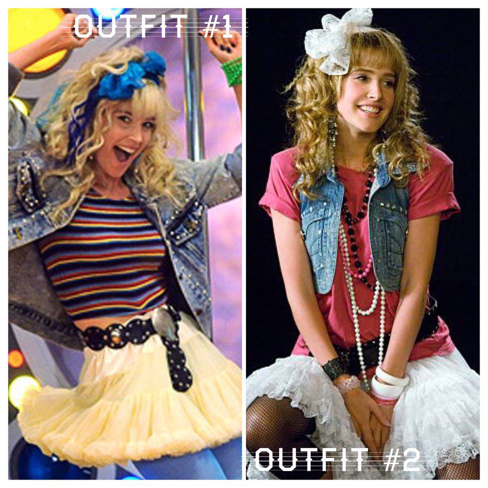 Outfit 1: blond wig, oversized denim jacket, striped crop top, yellow tutu, black studded belt, blue bow, blue tights
