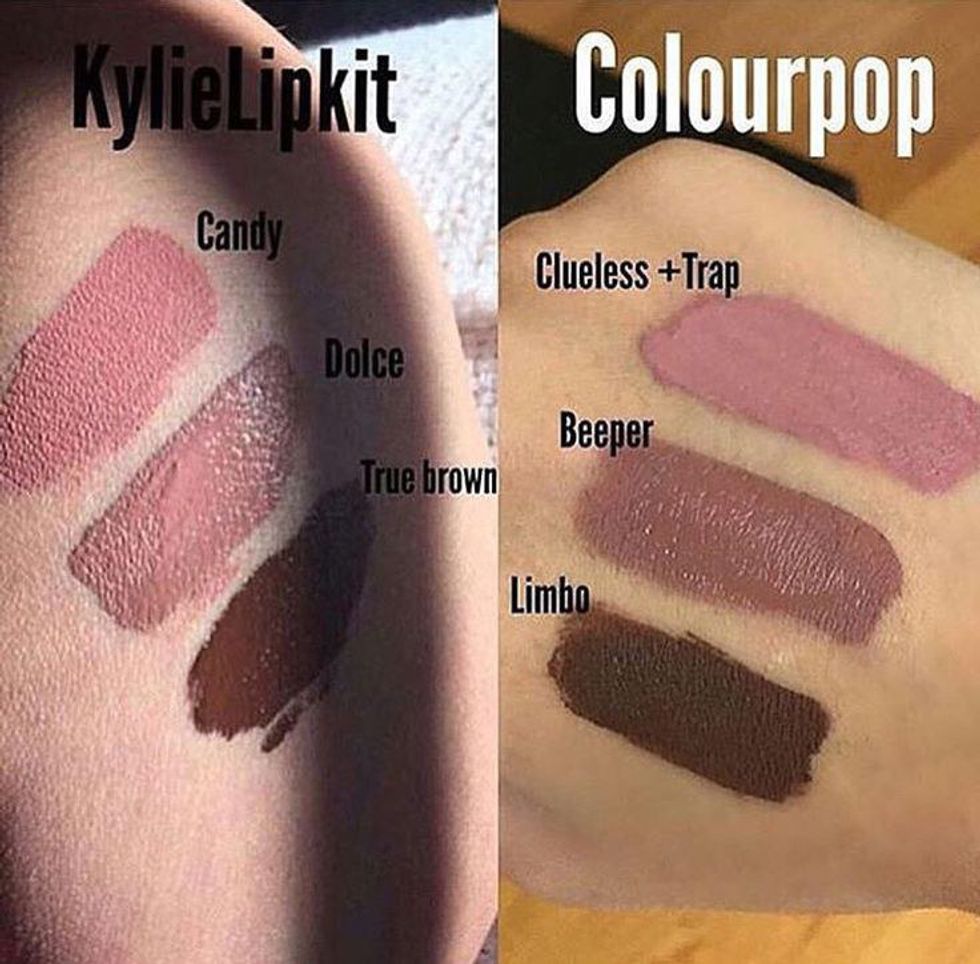 I've been seeing many articles and posts online accusing Kylie's lip kits of using the same or a similar formula to that used in 'ColourPop's' liquid lipsticks. It has been brought to the attention of consumer's that Kylie's lip kits get manufactured in the same factory as Colourpop's liquid lipsticks and that most of the color's Kylie has released can almost be matched identically with colors from Colourpop. Apparently both companies products are made in Spatz Laboratories, which is probably why both products have almost identical formulas.