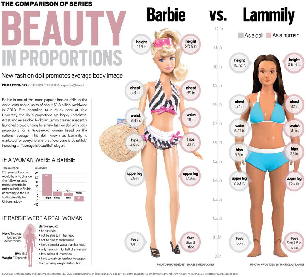 The first edition Lammily doll is presented as "fit and strong" featuring brown hair and very little makeup. She is equipped with jointed wrists, elbows, knees, and ankles, enabling her to wear either regular shoes or high heels. The doll, if a real human, would stand at 5 foot 4 inches, with a 31 inch waist, 33 inch hip measurement, and a size 7.5 shoe, in comparison to a Barbie doll that, if human, which would stand at 5'9, have a 18 inch waist, 33 inch hip measurement, and a size 3 shoe. Although Barbie is one of the most popular fashion dolls worldwide, her actual human counterpart would be anorexic, unable to lift her head, unable to menstruate, only have room for half of a liver and a few inches of intestines, and have to walk on four legs to support the top-heavy weight distribution of her body.