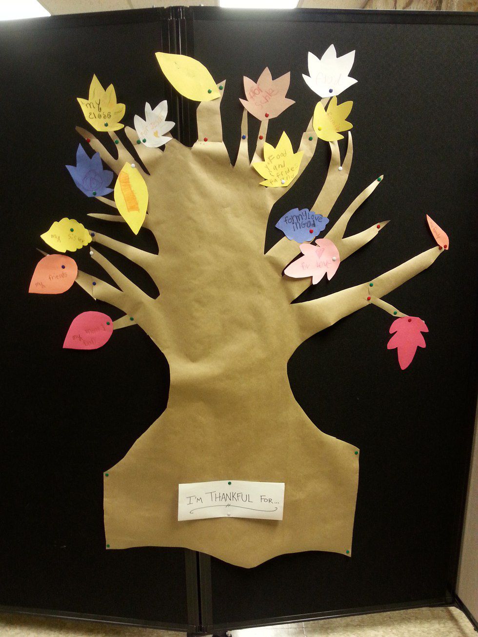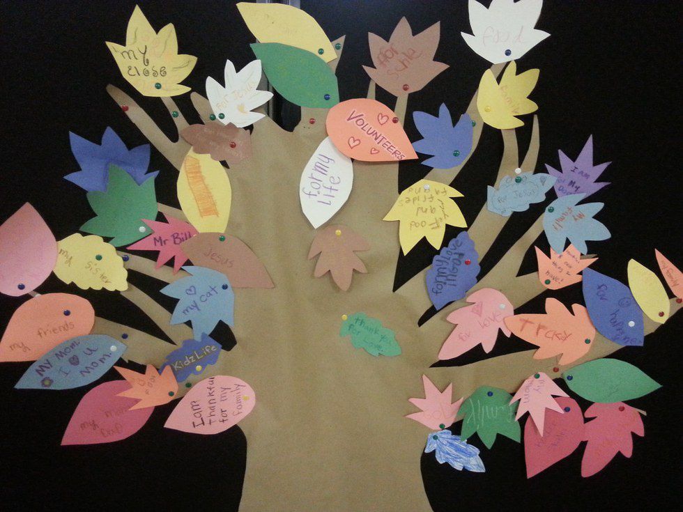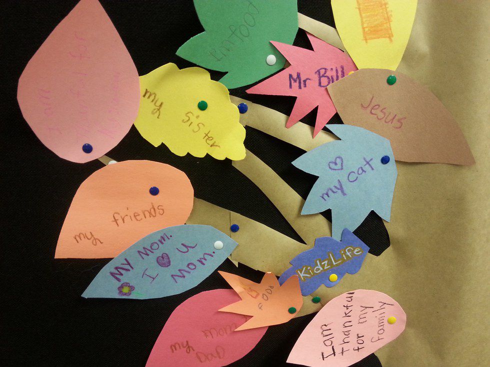 This weekend, at church, we gave children and volunteers a chance to create a collaborative project in which they wrote down some of the things they are thankful for. Answers ranged from things like food to family to God to roller skates, and all of the kids seemed happy to participate.