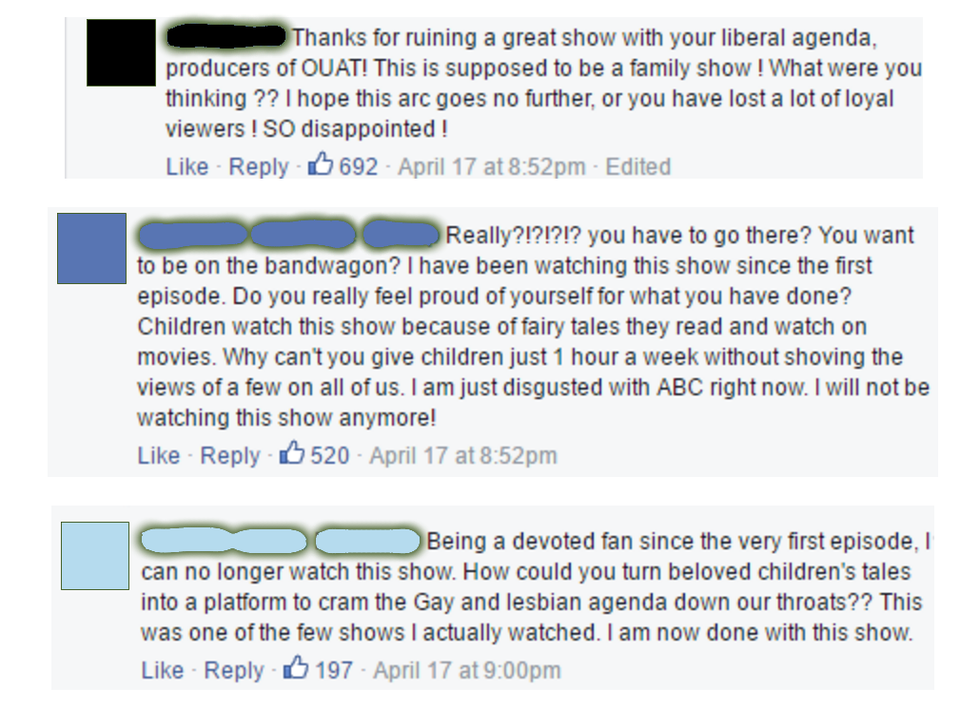 At first, I was mad, but the more comments I read the more I found the whole "controversy" highly amusing. Over the past five seasons, OUAT has portrayed blood, gore, violence, murder, pre-marital sex, children born out of wedlock, (hetero)sexual innuendos, and cursing. Let me get this straight (pun very much intended): all of what I just listed is completely family-friendly, but when two women kiss, we jump immediately to "OH, MY GOD, SAVE THE CHILDREN'S INNOCENCE" mode.