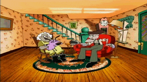 This is Courage's most classic quote. It's found in almost every episode as he tries desperately to save his family members from strange antagonists and finds himself wondering how he ended up there.