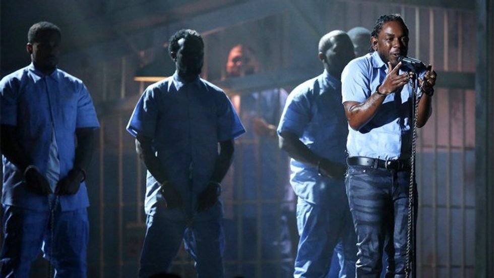 Guys, we need to talk about Kendrick Lamar's performance at the Grammys last Sunday, hip hop music, and the elephant in the room. His live act, which consisted of him and his background dancers solemnly entering the stage for him to slowly wrap his enchained hands around the microphone before starting in on his single, "The Blacker the Berry," and then subtly transition into "Alright," was among the most profoundly provocative, powerful performances of its time. A performance like this was especially bold coming merely a week after Beyonce was publicly attacked for her own social statement at the Super Bowl halftime show, and it was obvious that something special was about to happen in front of us from the moment that his handcuffed hands held the microphone. Mr. Lamar's performance did not disappoint, but maybe that's just what we ought to expect from him at this point.