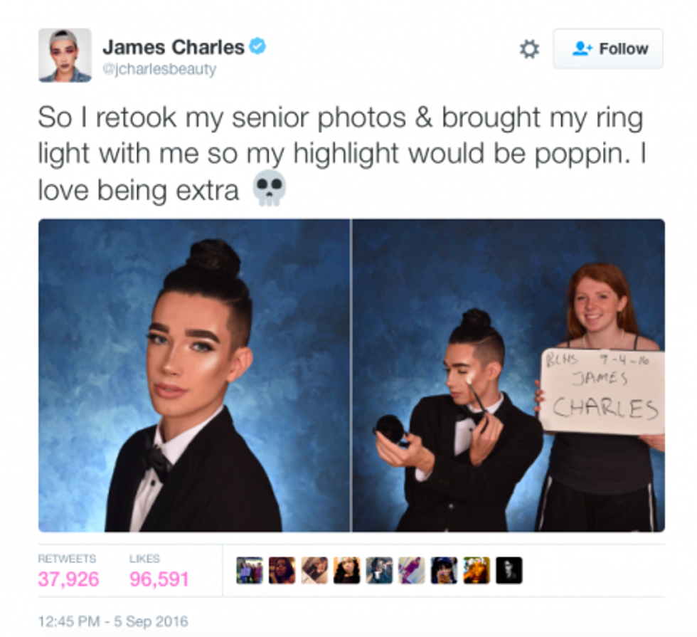 James Charles is no stranger to being a topic of much conversation, especially after his senior pictures re-take went viral on Twitter. Apparently, Charles wasn't particularly thrilled with the way his original pictures came out, so he brought his own lighting set up to the shoot.