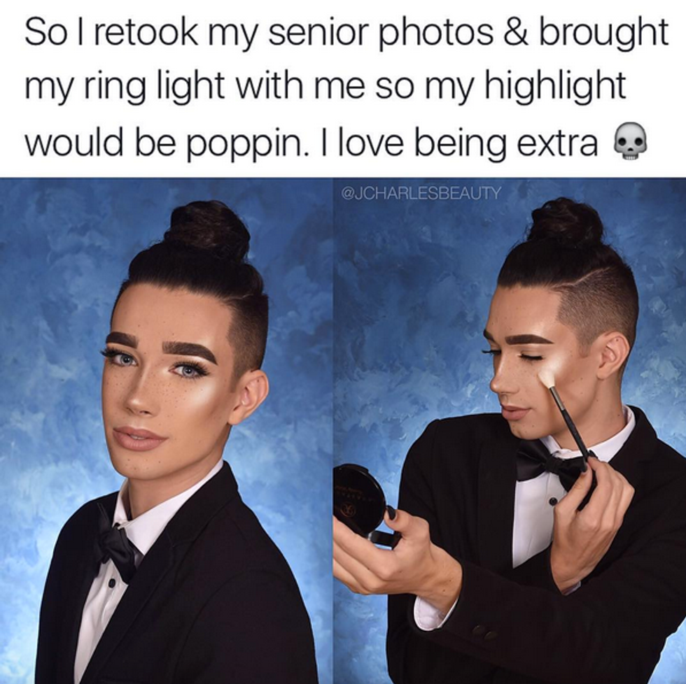 Only a year ago, then-16-year-old James Charles posted his first makeup picture on Instagram -- an iridescent-purple glowy look on a beautiful model. Since then, he has gained over 650,000 followers on Instagram and 100,000 subscribers on YouTube (and I can definitely see why).