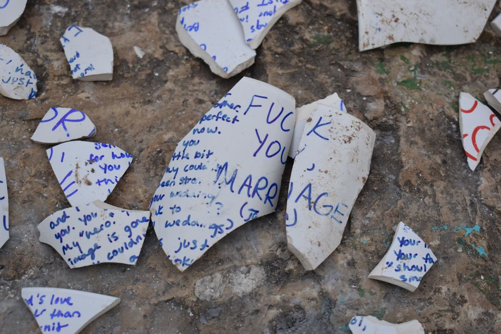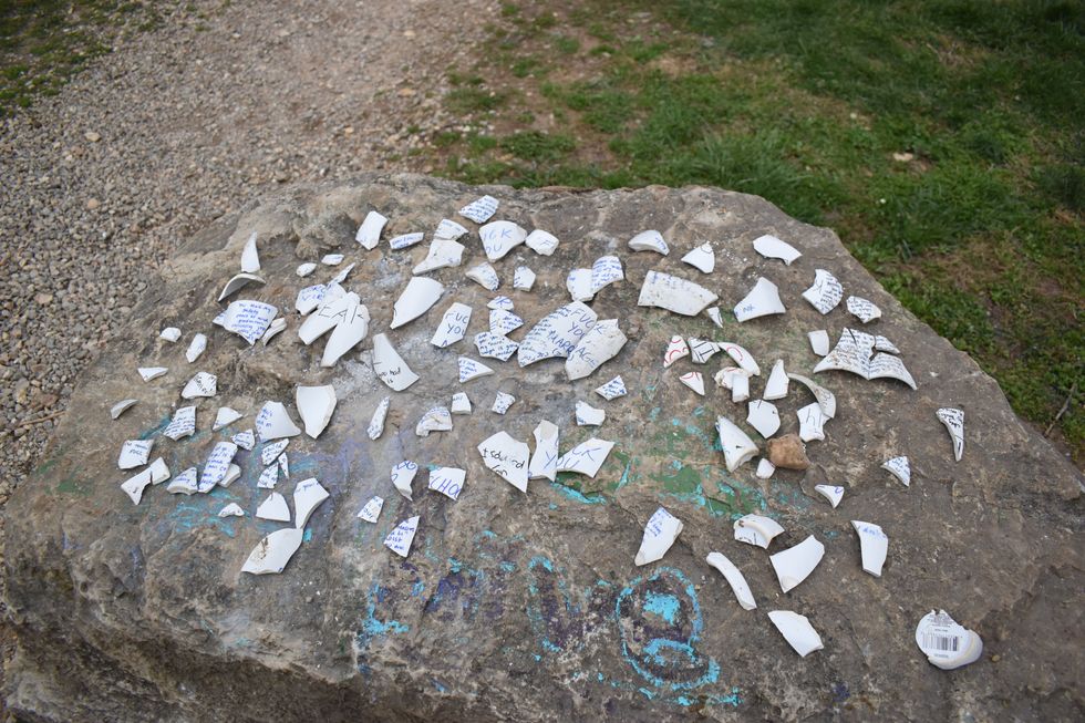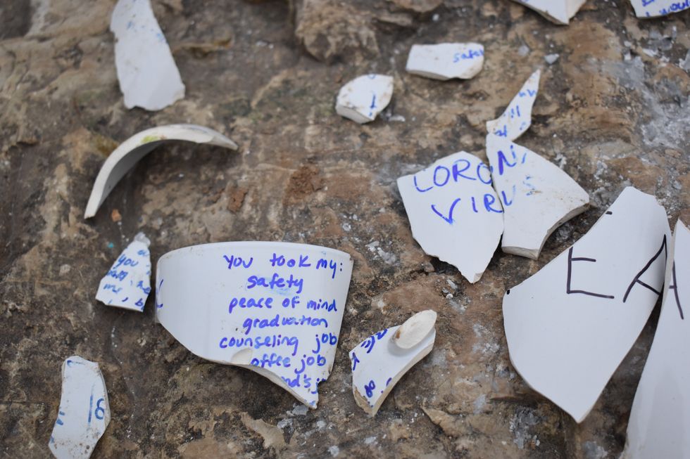 The reality of all of this hit when we made it back to the end of the trail, after four and a half hours of hiking. On a rock, shattered pieces of pottery with writing on them told individuals stories regarding the virus.