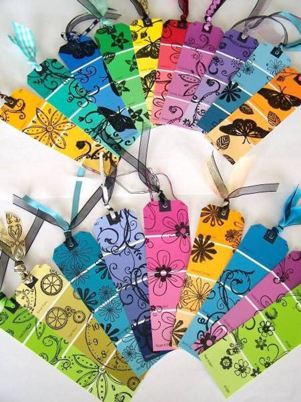 Paint chips are just so useful, as you've probably noticed and not just for painting your house. For this, all you need are paint chips, a hole punch, some ribbon and some markers. You can laminate them if you have access to a laminating machine, but it's not necessary.