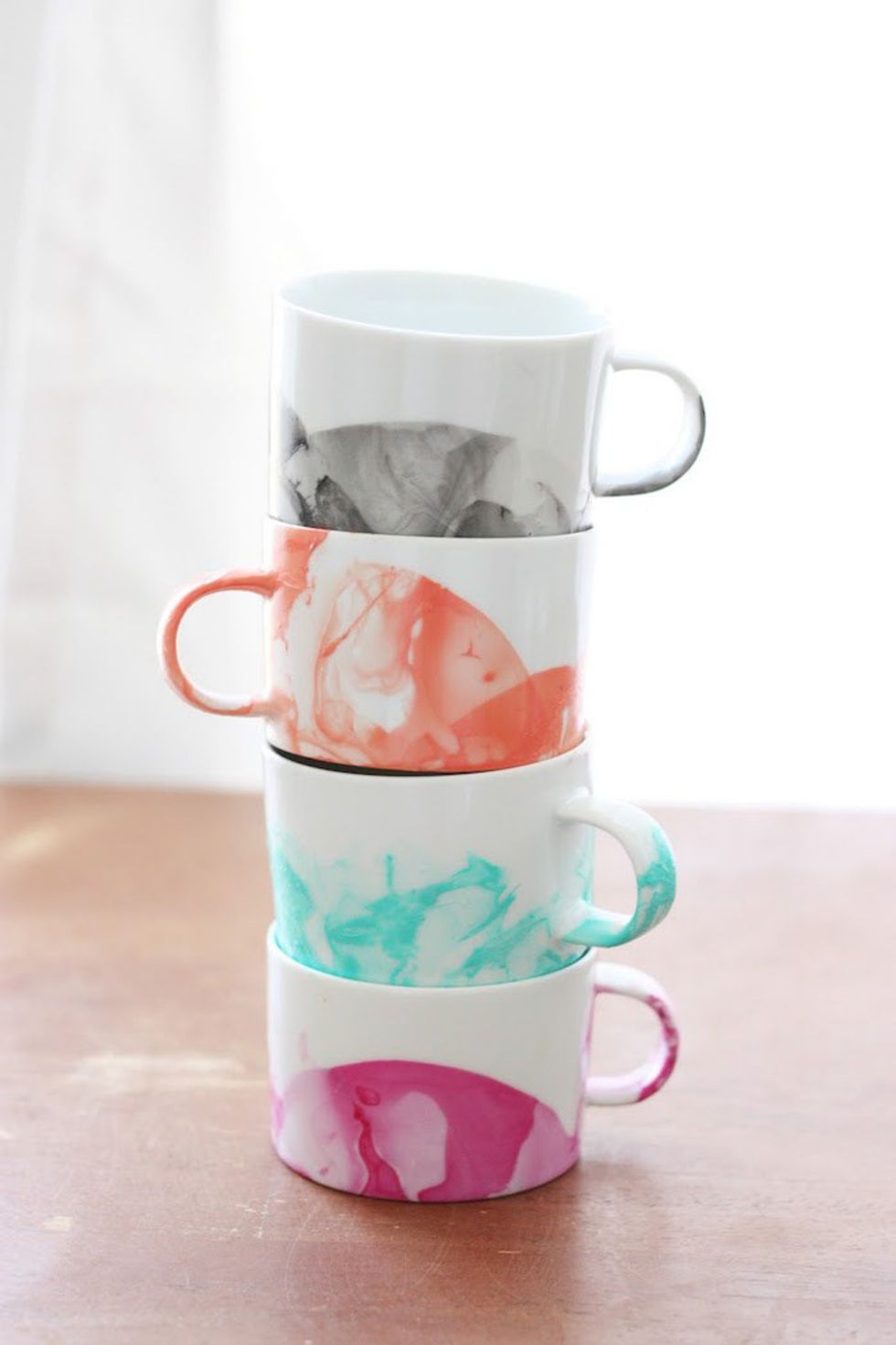 Aren't these so pretty? All you need for these are white mugs, nail polish, tooth picks, hot water and a container (that you don't mind getting ruined). You can see the full tutorial here. Please note, these aren't dishwasher safe or microwaveable.