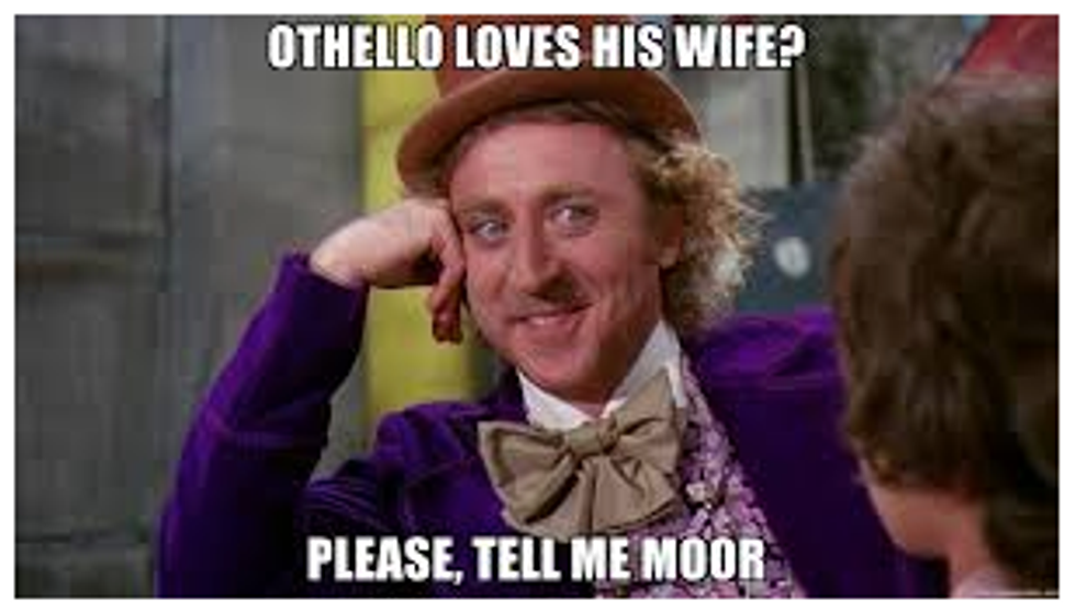 Big bad Venetian general Othello doesn't promote his right-hand man Iago, so Iago gets butt hurt and decides he will ruin Othello's entire life. Going off of Othello's insecurity, Iago manipulates and lies to make Othello jealous and think his wife, Desdemona, is cheating. In the end, Othello smothers Desdemona with a pillow for cheating. Welp.