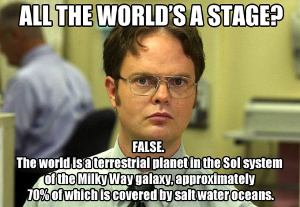In all seriousness, William Shakespeare was pretty wicked in his writing. He dominated his time and even now, some 400 years later, he still dominates the English language. While this was only a crash course in Shakespeare, I cannot recommend to everyone enough, that if given the opportunity to study Shakespeare, take it.