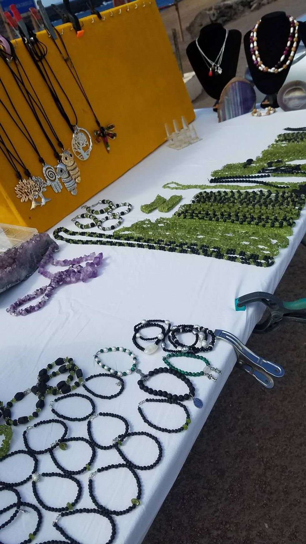 When a volcano erupts, it often erupts giant pieces of lava rock or volcanic bombs that turn to rock in the air as they fall back down to ground and inside these rocks can be found the mineral Olivine which is often used for jewelry and such things as seen below from a vendor in the Volcanic national park here on Lanzarote Island.