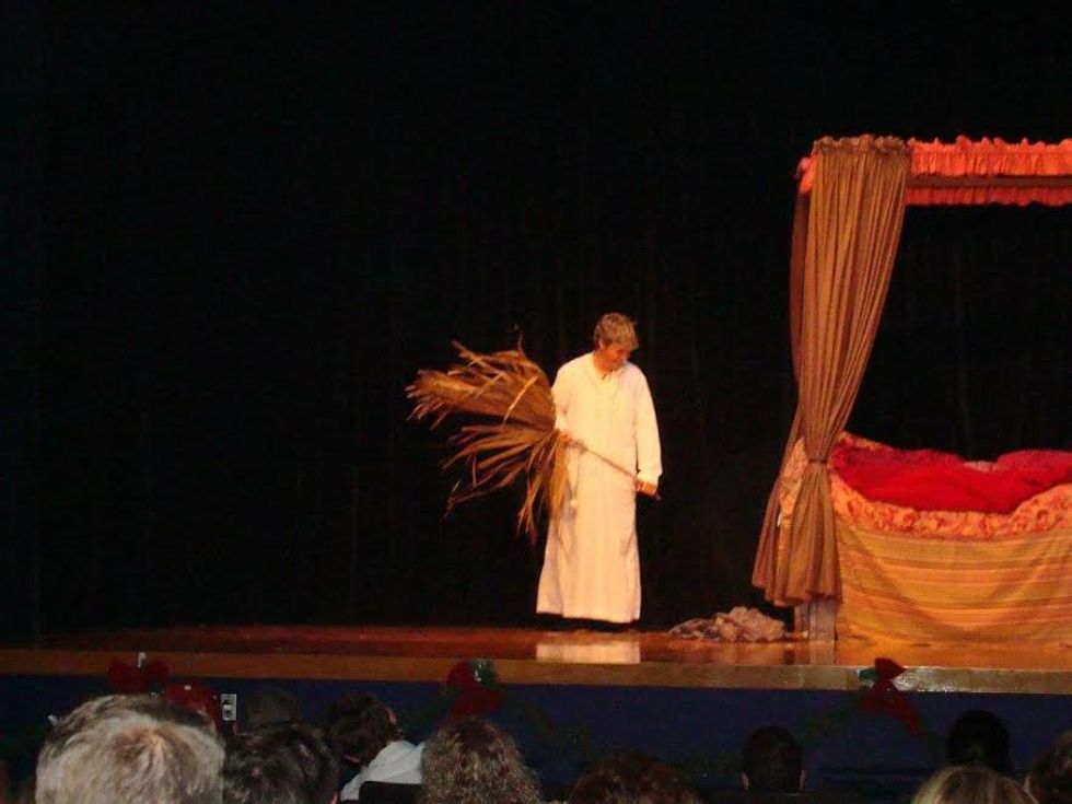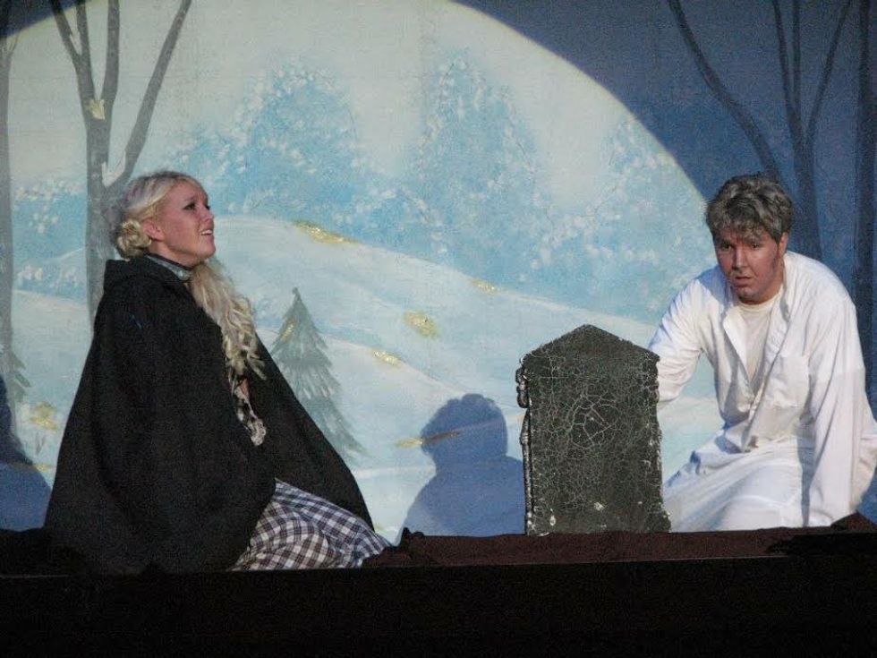 The photo above is of me as Ebeneezer Scrooge in my high school drama club's original adaptation of "A Christmas Carol." As you might be able to decipher, the scene pictured above is the climactic scene in which The Ghost of Christmas Yet to Come takes Scrooge to visit his neglected grave. Meandering drastically from the book and film adaptations, however, the girl to my right is that of Scrooge's life long love, Belle. Belle is found sobbing, kneeling next to her beloved's grave, realizing her failure as Scrooge's salvation.