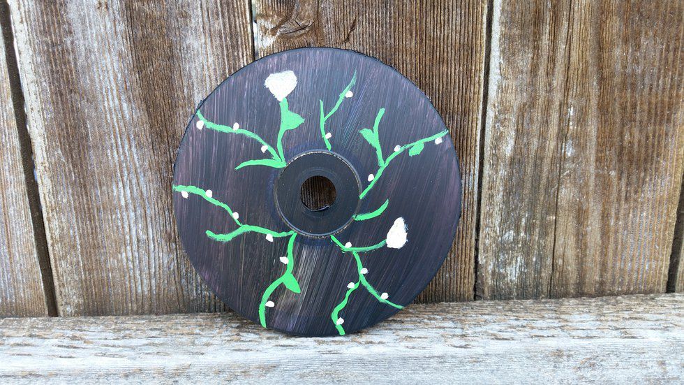 I was extremely skeptical of this project when I saw it. Not because it looked difficult or complicated but just because my painting skills are already minimal when using a regular canvas. However, there is something about the round shape of the CD that makes the overall final project rather appealing. I first started out by painting an old CD with black paint. To be quite honest, I’m not really sure why I did that because the pin shows just regular CDs with designs on them, but who knows what I was thinking. After that dried, I proceeded with my simple pattern of vines and flowers because that’s about as far as my skills go. In the end however, I actually really like the way it came out and this project is so ridiculously easy I will definitely try it with my friends next time.
