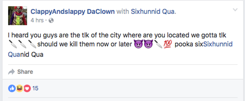 "My opinion on these clowns is that these are two low lives that have nothing better to with their time, except to break the monotony of their lives. Working a minimum wage job at McDonald's, they have to resort to buying cheap costumes at CVS and harassing people. They aren't going to do anything because they announced their arrival. My attitude is this: get lost."